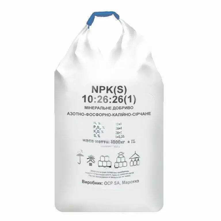 Минимальная партия Диаммофоски 10:26:26 – 1 биг-бэг (самовывоз)от 20 - доставка бесплатно в радиусе 150 км от Кропивницького. Купить удобрение диаммофоска 10:26:26 Диаммофоска (NH4)2HPO4 – азотно-фосфорно-калийное, комплексное, гранулированное минеральное удобрение. Содержит не менее 10 % аммонийного азота, не менее 26 % массовой доли общих фосфатов. Гранулы розового или красного цвета не более 6 мм. Для повышения урожайности, почва должна содержать питательные микроэлементы необходимые растениям. Азот, фосфор и калий эти три основные элементы просто необходимы для роста растений, а их избыток плохо сказывается на урожайность. По этому, почву просто необходимо подкармливать комбинированными удобрениями перед посевом и во время роста. Одно из таких удобрений – диаммофоска имеет полный спектр микроэлементов и полезных примесей, таких как сера, магний, цинк, калий, железо и др. Удобрение широко применяется в сельском хозяйстве и используется в любых климатических зонах, особенно рекомендуется для торфяных и старопахотных почвах которые содержат много азота, а также с небольшим содержанием фосфора и калия. Все питательные элементы диаммофоски, содержаться в водорастворимой форме благодаря которой легко усваиваются растениями и обеспечивает их равномерное питание в течении всего вегетационного периода. Использование диаммофоски положительно влияет на урожайность, культуры приобретают устойчивость к вредителям, различным болезням и неблагоприятным климатическим условиям. Сбалансированное соотношение питательных элементов делает диаммофоску идеальной для основного удобрения ленточного внесения и подкормки зерновых, пропашных, технических культур, а также виноградников и плодовых деревьев. Удобряйте почву диаммофоской и всегда будите с урожаем! Основные преимущества: