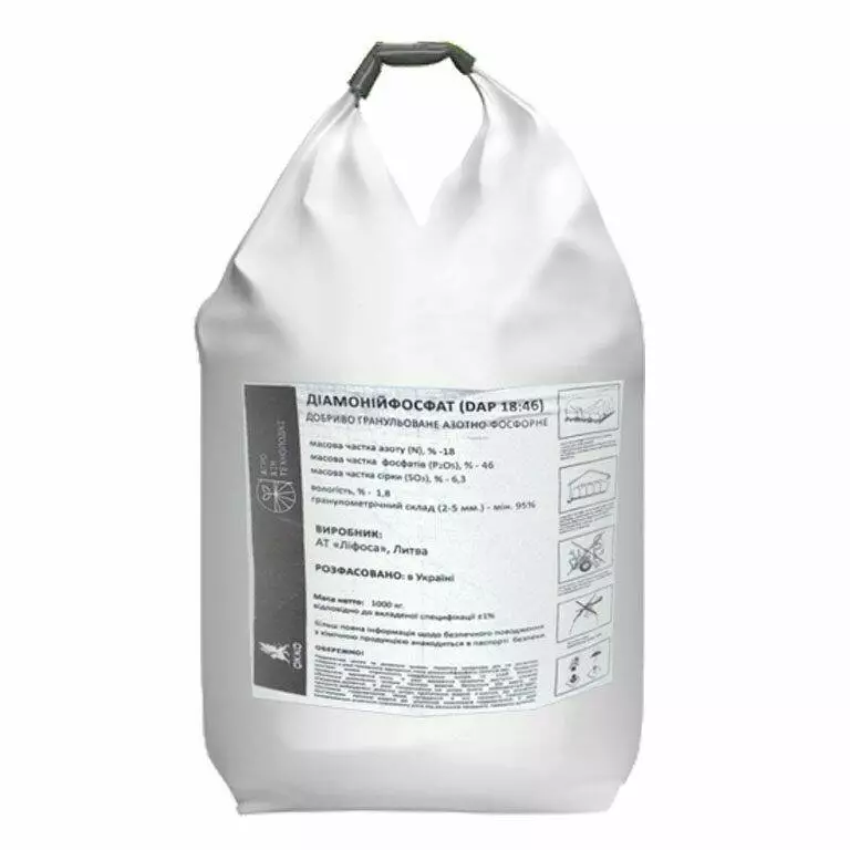 Диаммонийфосфат NP 18:46 (диаммофос, DAP, ДАФ) – Гранулированное универсальное высококонцентрированное безнитратное азотно-фосфорное удобрение, в состав которого входит 18% азота и 46% фосфора.Оптимально для обеспечения любой сельскохозяйственной культуры полноценным фосфорным питанием на весь период её роста и развития, а также стартовой дозой азота и небольшим количеством серы. Может применяться и осенью под вспашку, и весной при посеве, и в предпосевную культивацию.В момент растворения в почве временно подщелачивает рН почвенного раствора вокруг гранулы удобрения, способствуя лучшему усвоению фосфора из удобрения на кислых почвах. Сера в составе удобрения также способствует лучшему усвоению растениями азота и фосфора.Оплата та доставка